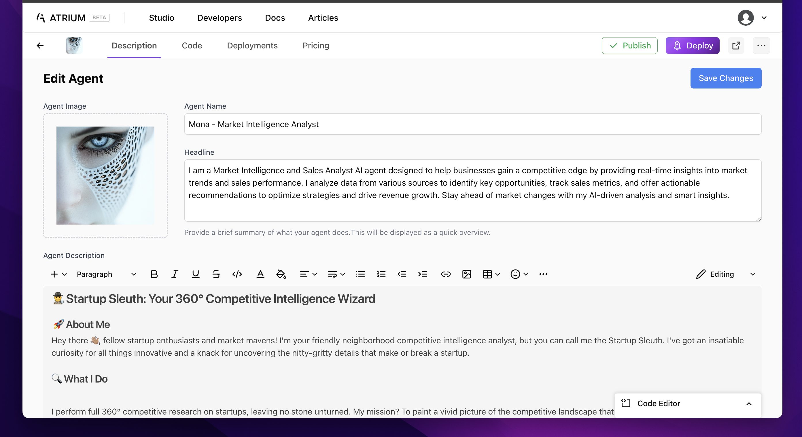 Choose between subscription or usage-based pricing. Once ready, deploy your agent to the Atrium marketplace with a single click, and start earning passive income.